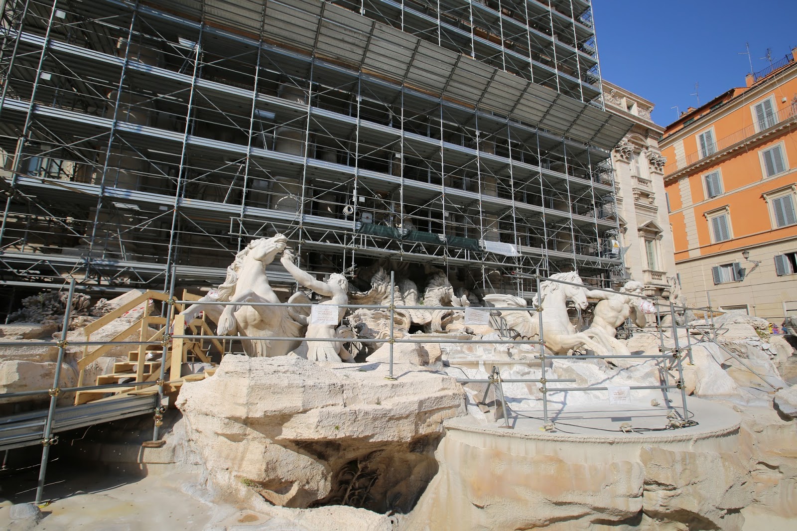 看到這幅景象的時候,我差點哭了出來。不是因為終於來到了許願池真跡前面而感動,而是這個整修中的鷹架是怎麼回事,整個噴泉根本全部都被包圍了,連池水也放乾見底,只差沒開放遊客到池子裡面散步拍照!