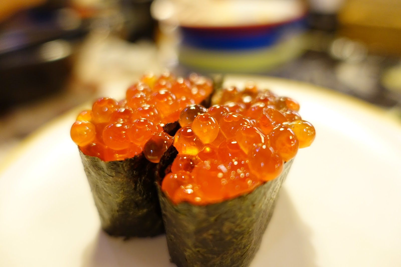 丸壽司晶瑩剔透的鮭魚卵軍艦。
