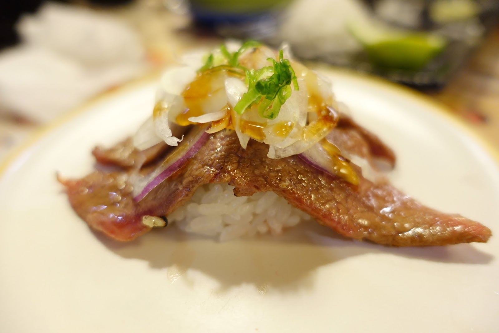 丸壽司炙燒牛小排。炙燒牛小排握壽司也是隱藏菜單,偶爾會出現在轉盤上,但多半得自己問師傅。