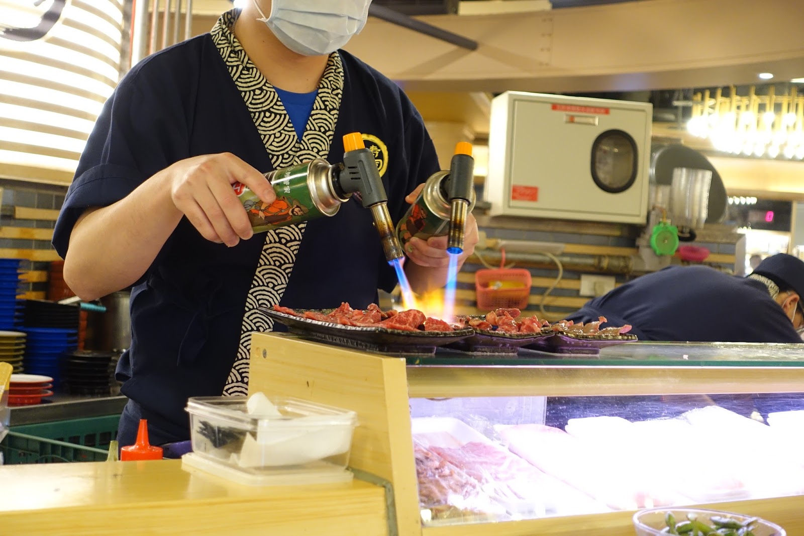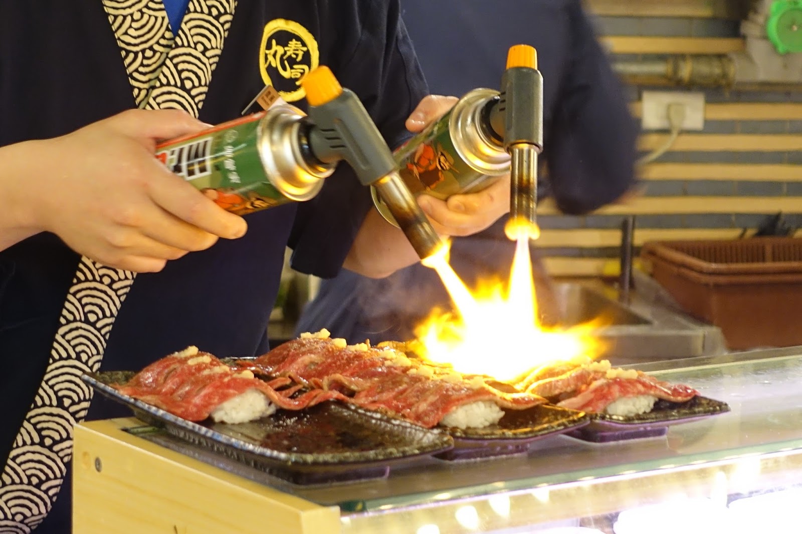 丸壽司大火雙槍炙燒牛小排握壽司。經常缺貨,想吃還不一定有得點。