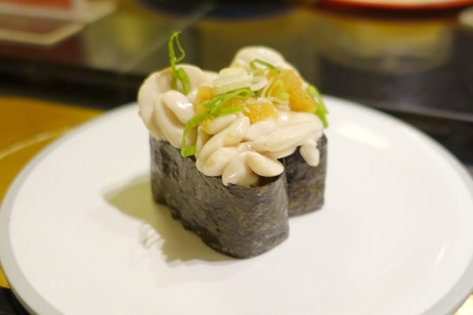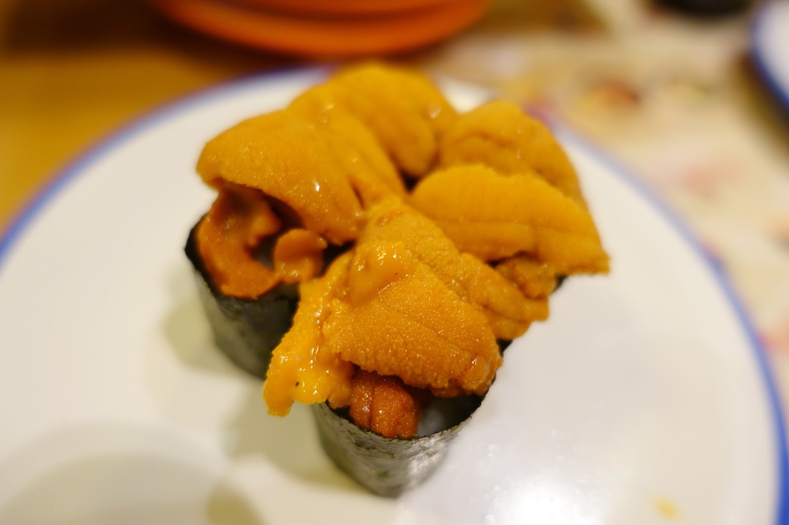 丸壽司另一個超級難遇到的經典料理:300元淺藍盤北海道馬糞海膽軍艦。你在菜單上面看到210一盤的海膽軍艦是加拿大海膽,平常如果沒有特別指定直接點餐或者從迴轉盤上拿取一定都是加拿大海膽。這兩種海膽味道天差地遠,我們有吃過一次加拿大海膽,覺得卵味實在太淡了,沒有花了210該有的味覺滿足感,所以後來統一只詢問師傅當天有沒有馬糞海膽,沒有的話建議直接跳過這道料理。