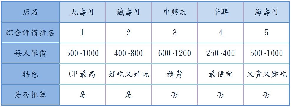 最後為大家整理一下五間迴轉壽司的總體評價: