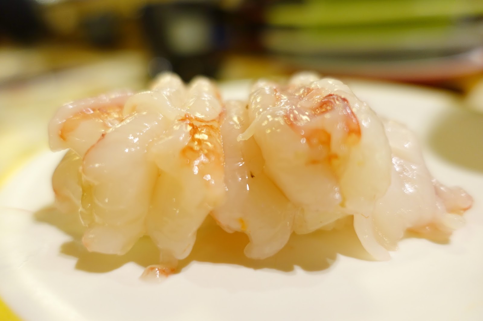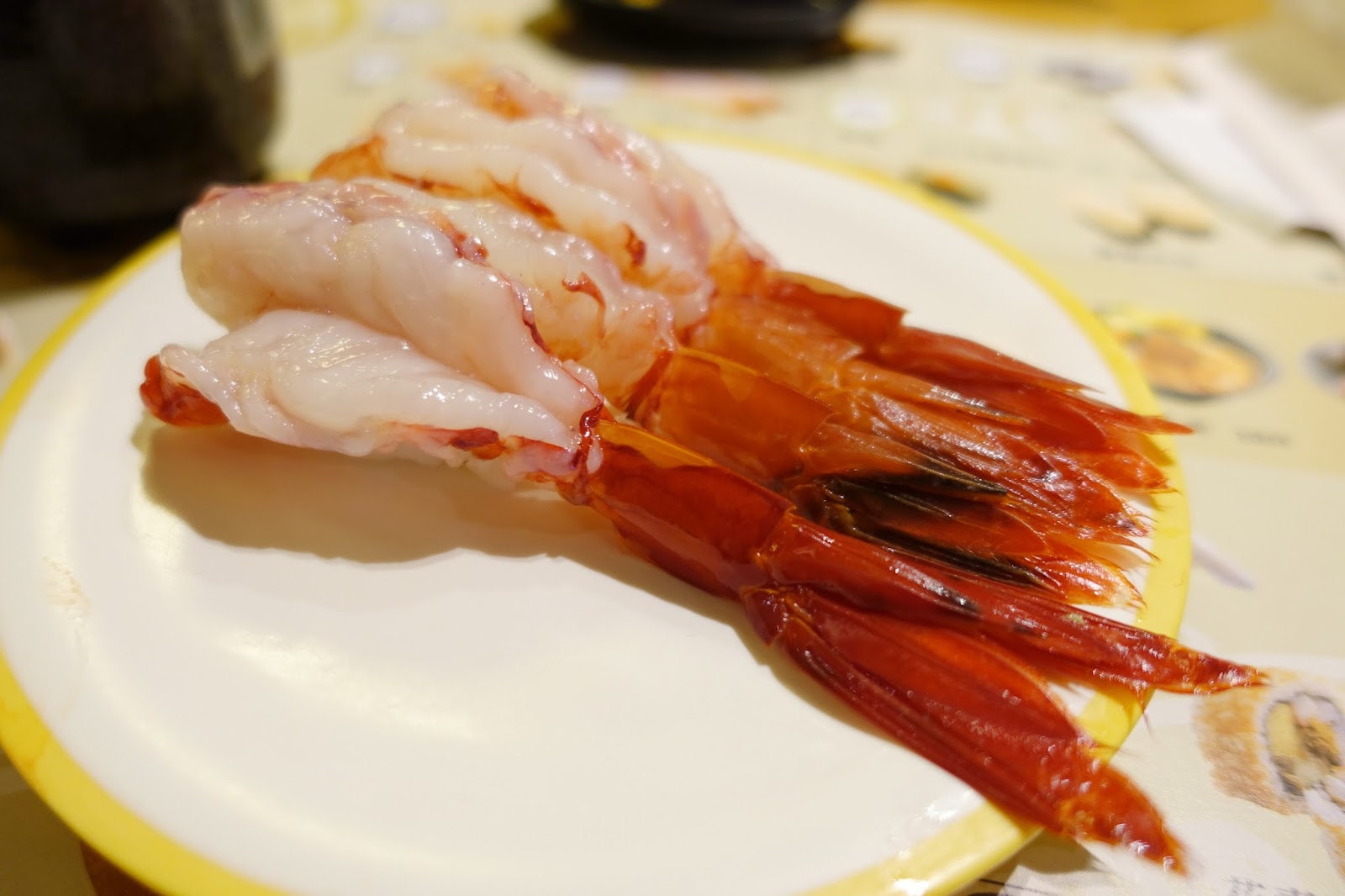看看這個要價150塊的丸壽司黃盤,兩貫胭脂蝦握壽司卻硬生生塞上了四隻胭脂蝦,導致整個飯團根本被蝦子給淹沒了,完全看不到。這麼奢華又豪邁的握壽司料理絕對無法讓你在一盤50塊錢以內能吃到,所以也只好轉成高單價盤了。