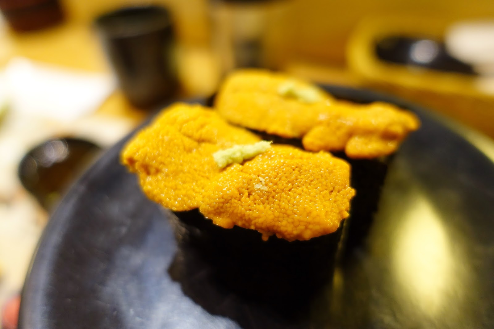 丸壽司的馬糞海膽軍艦雖然要價不斐,但是海膽給的份量十分充足,完全是滿出軍艦海苔捲的程度,並且每一片海膽的形狀都相當完整,色澤也呈現迷人的橘黃色,同時表面非常濕潤,不管視覺上或實際吃起來新鮮度都是滿分。看看那顆粒分明的海膽卵巢結構與中間清晰的分隔線,即使到了高級的無菜單日本料理頂多也就這個程度了。