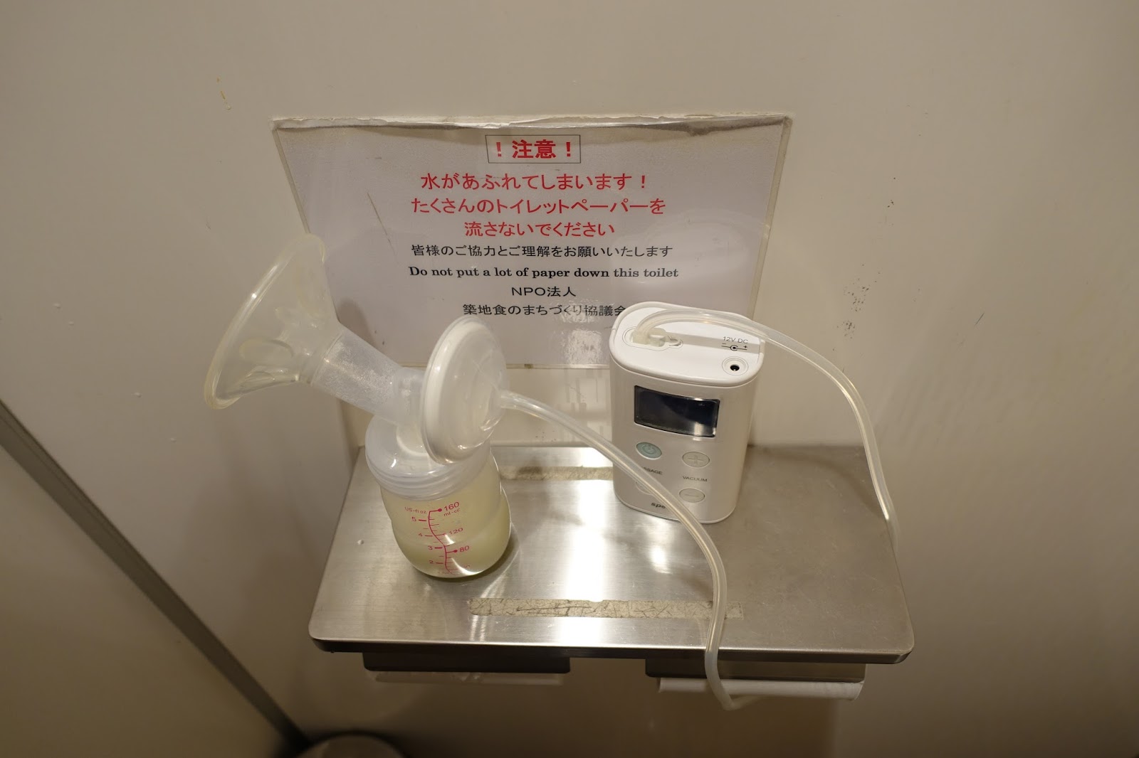築地遊客中心的廁所基本上滿乾淨的,也沒什麼味道。清晨6點不會有人跑來使用,所以擠奶擠的很放心。集乳器可以放置在衛生紙架子上,門上也有隨身物品掛勾可以掛外套跟包包,所以最困難的部分就這麼克服囉。