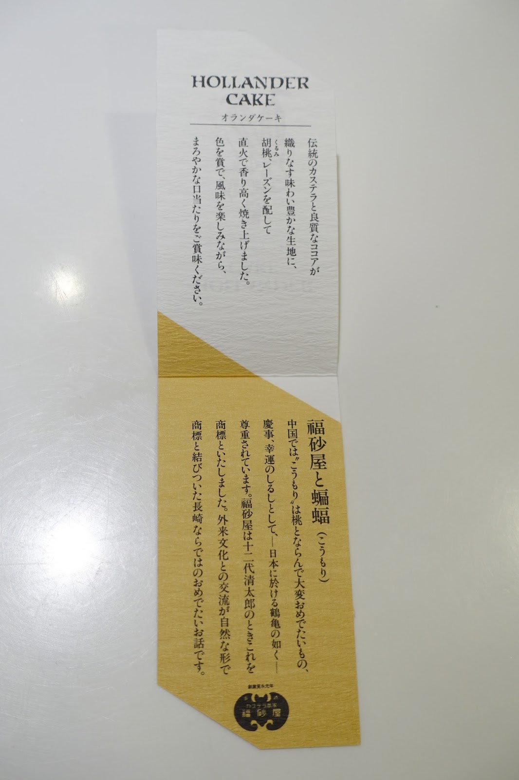 字條大致上寫著:蝙蝠在中國是吉慶喜事的象徵。第12代子孫清太郎,為達到將長崎蛋糕成為代表長崎的蛋糕點心的願望,特別將蝙蝠作為新商標。在中國,蝙蝠與桃花並列,是吉慶喜事的象徵,具有祝福的意義。因為蝙蝠的「蝠」字跟「福」字同音,又因長崎自古以來就有與中國頻繁交流的歷史背景,所以很自然地將蝙蝠作為商標使用。
