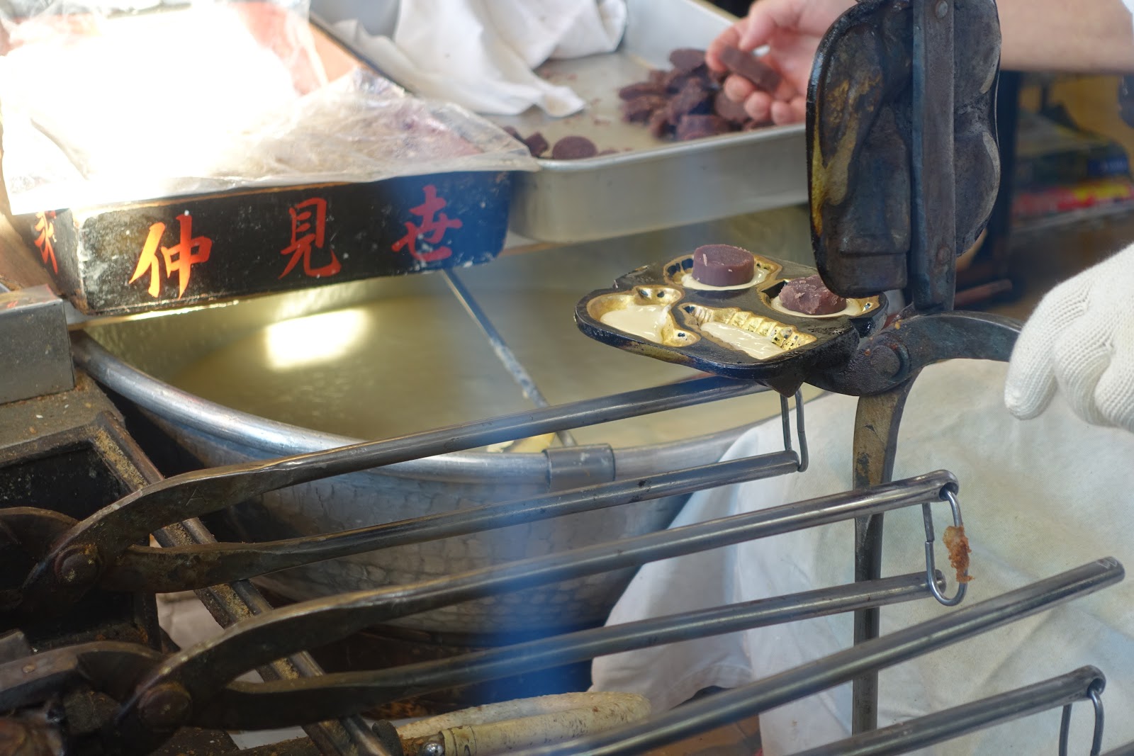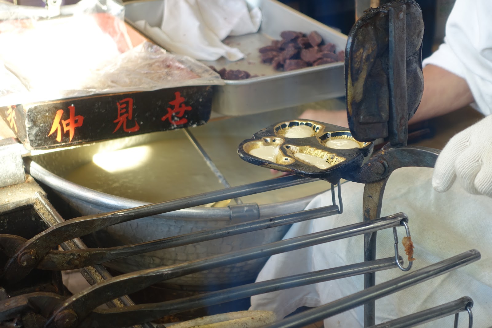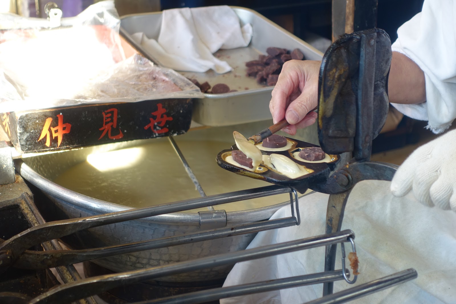 仔細看他放進去的紅豆餡,竟然事先有塑形好。圓的圖案放圓形的紅豆餡;長條型的圖案則放長的紅豆餡。而不是我們一般看到的現場挖一塊紅豆把模型塞滿這種作法。事先裁切過的紅豆餡能讓每個人形燒出來的品質更穩定,無論形狀以及份量都能得到控制,真的十分講究啊。