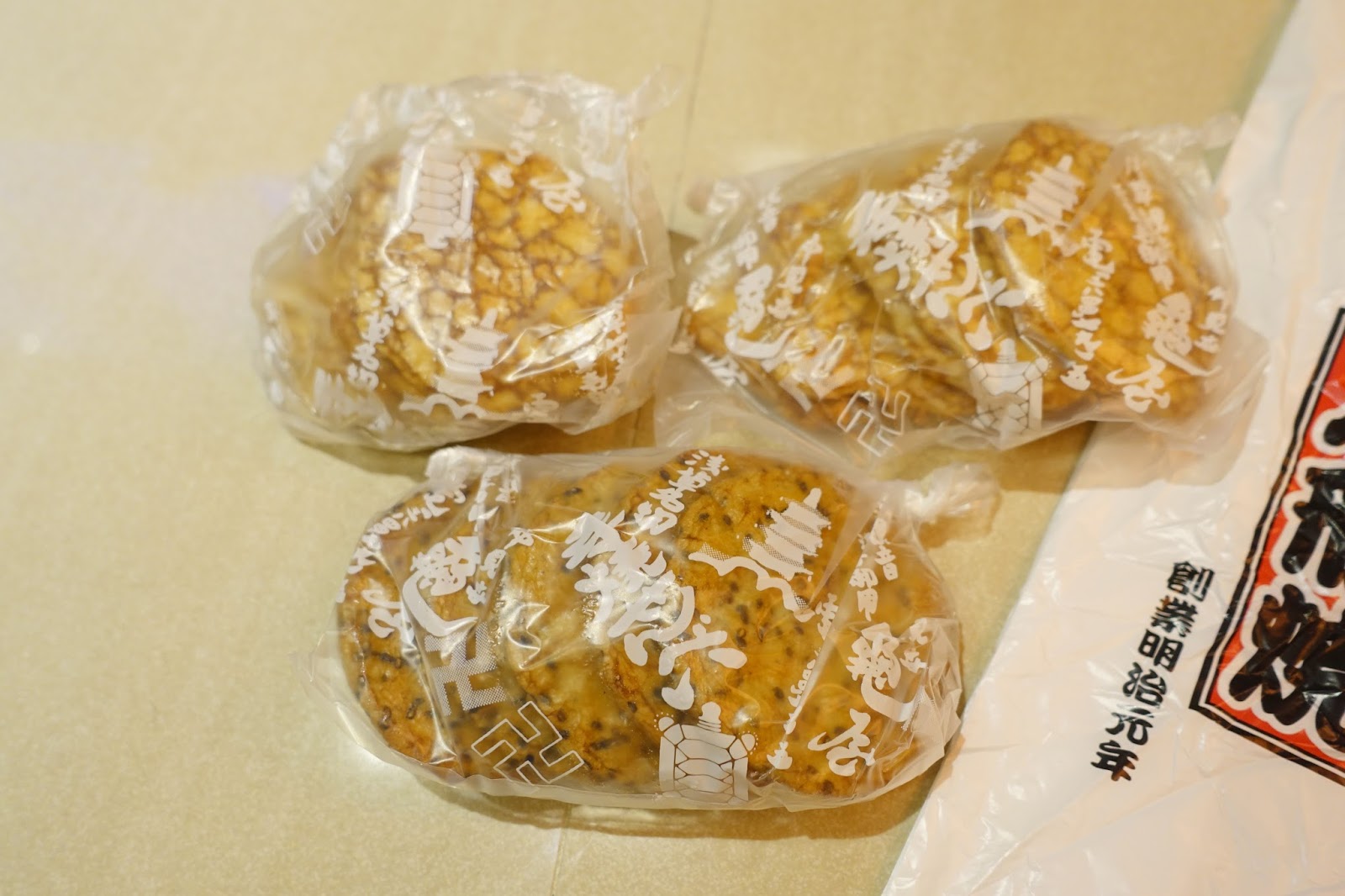 仙貝一共買了三包,除了一包胡麻子口味的,另外兩包都是厚燒醬油。