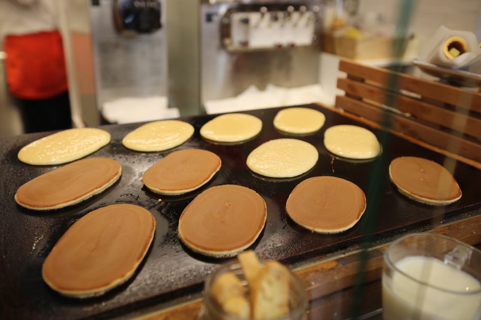 明明是純人工作業,但每個銅鑼燒的皮看上去幾乎一模一樣大,而且排列超整齊,連斜的角度都一樣,簡直鬼斧神工。