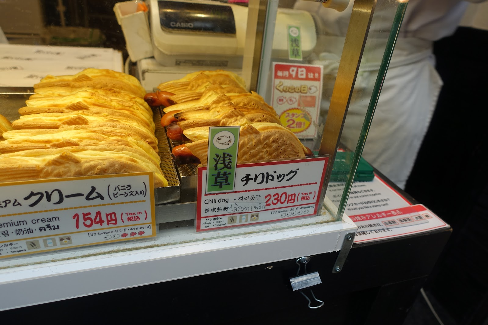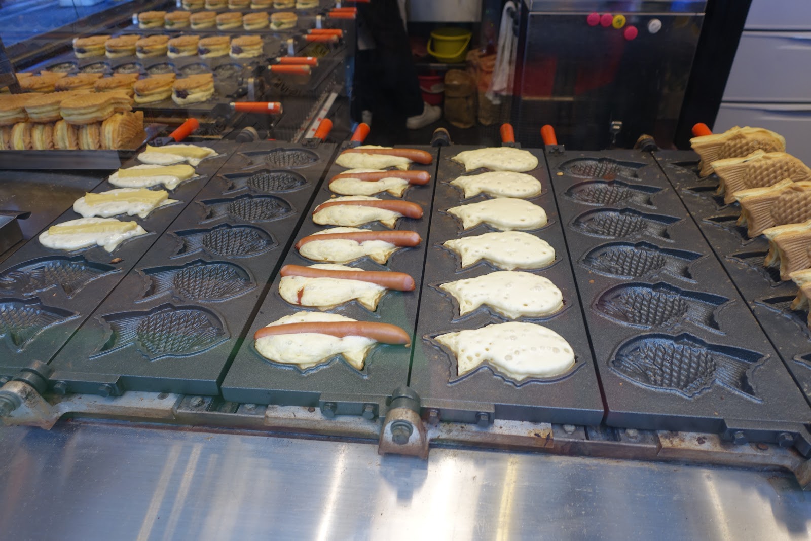 最後看一下限定的熱狗口味製作實況,其實就是把整支熱狗插在鯛魚燒中間。熱狗事先已經用水滾過煮熟了,因此需要加熱的只有鯛魚燒的外皮。下次有再來淺草寺的話,一定要選個限定口味品嚐看看。