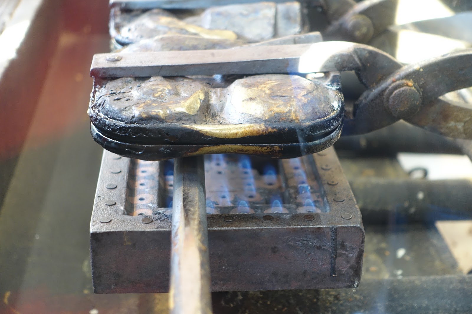 兩邊的麵糊都已經8分熟後,再將模具合起覆蓋,並翻轉到同一邊。這時候已經可以看到膨脹的麵糊整整超出模具快要2倍!