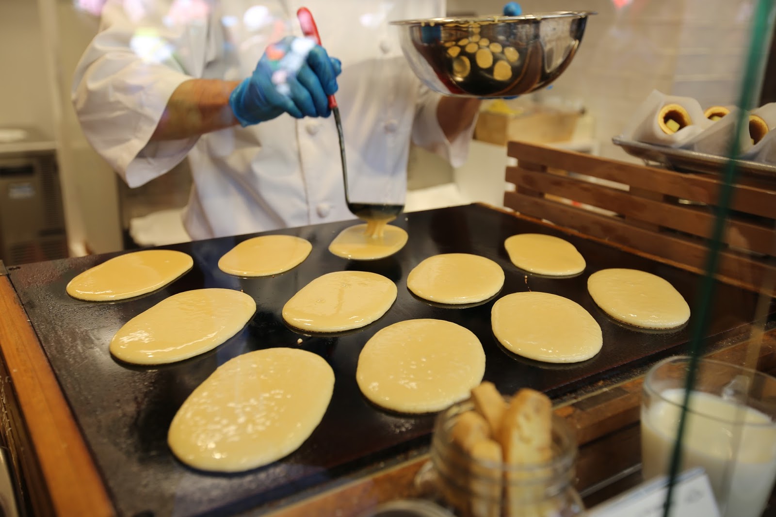 師傅僅用一個小鏟子就能快速的把皮翻面,而且完全不會弄壞表面或者沾到還沒凝固的麵糊汁。
