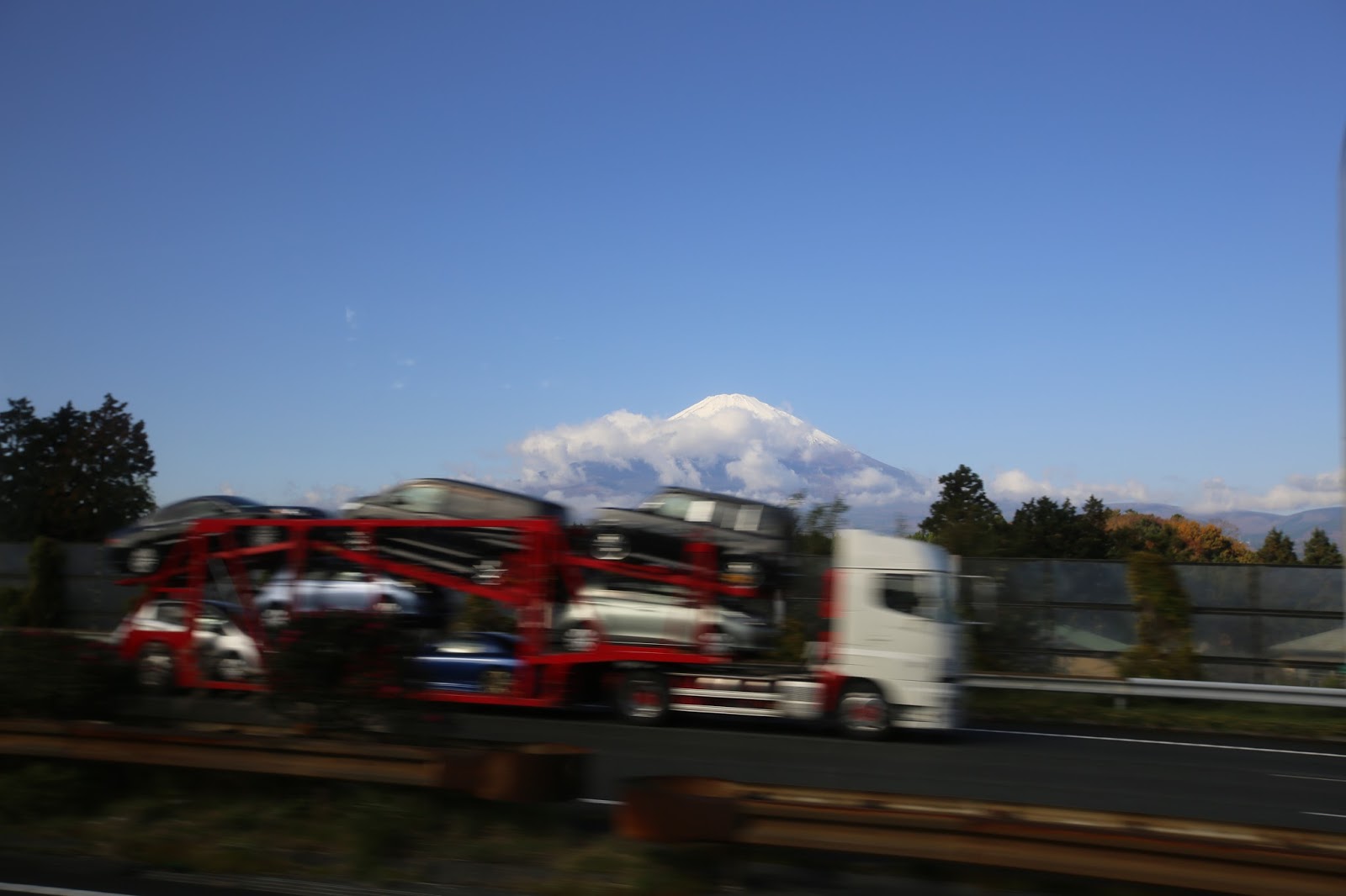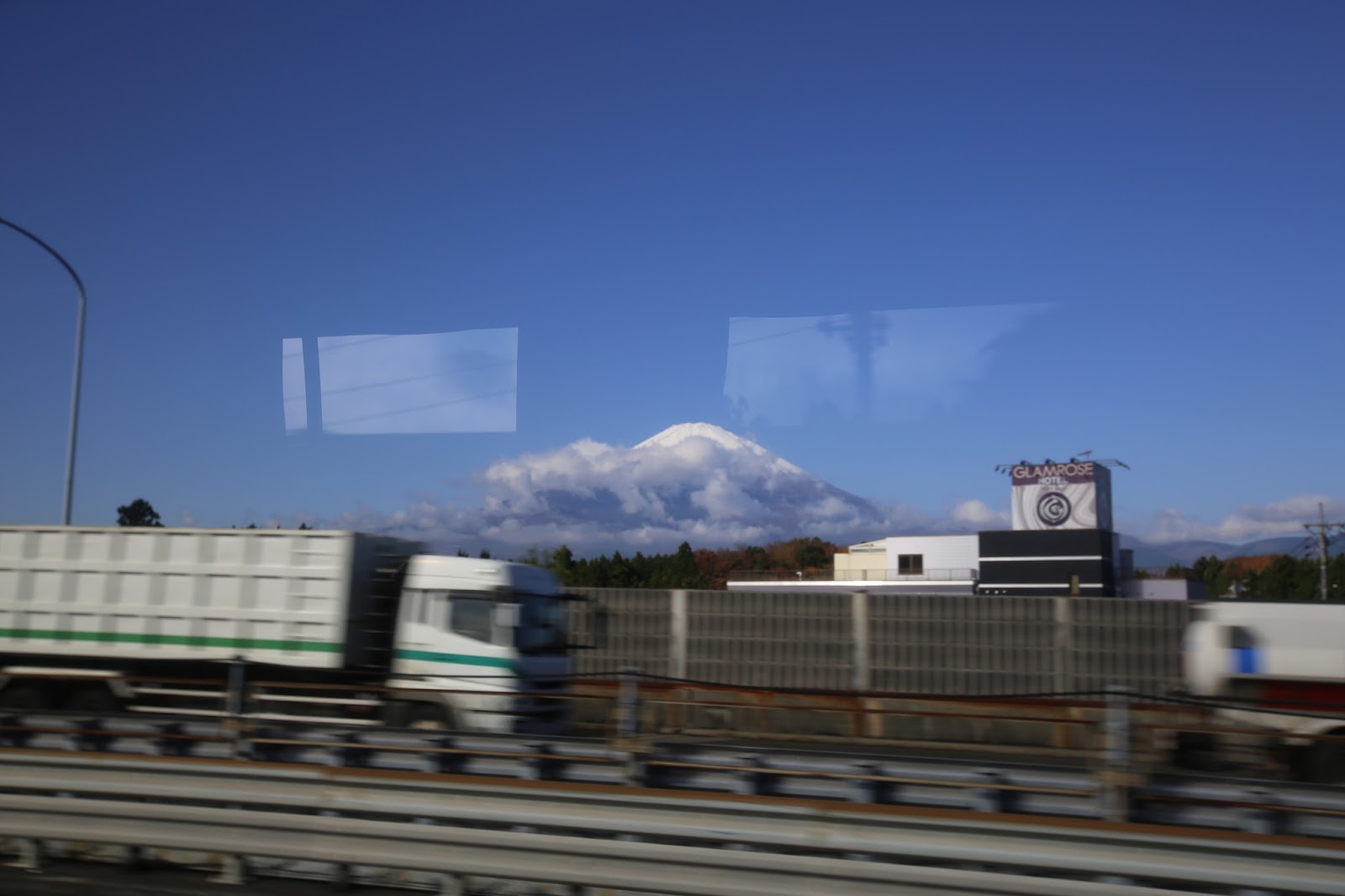 這些照片都是在高速巴士上面拍的,所以可以看到前景超級無敵快的閃過。但是遠遠掛著白雪美麗的富士山,卻是很悠哉的躺在那。從來沒親眼看過富士山的台灣人鄉巴佬在巴士上面興奮的猛拍照,卻不經意發現隔壁日本妹與他的男人也是拿出手機拼命按快門,鄉巴佬的程度可以說是不相上下。