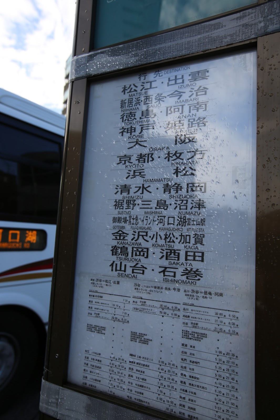 一般從東京出發往河口湖的高速巴士有兩個上車地點,一個在新宿(單程日幣1750,預計車程1小時45分)、另一個在澀谷(單程日幣1800,預計車程2小時30分)。通常會依照自己住在東京哪個區域,交通比較方便抵達的地方來預約車票。
