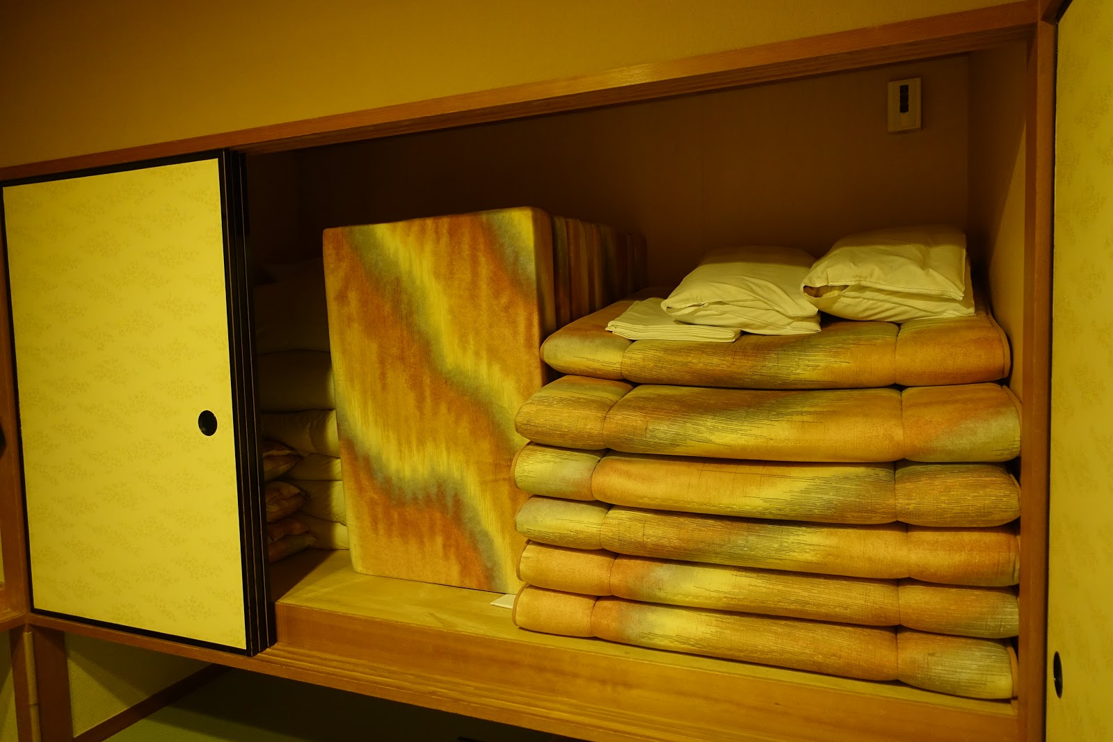另一邊的櫃子中放的是晚上鋪床要用的床包們。