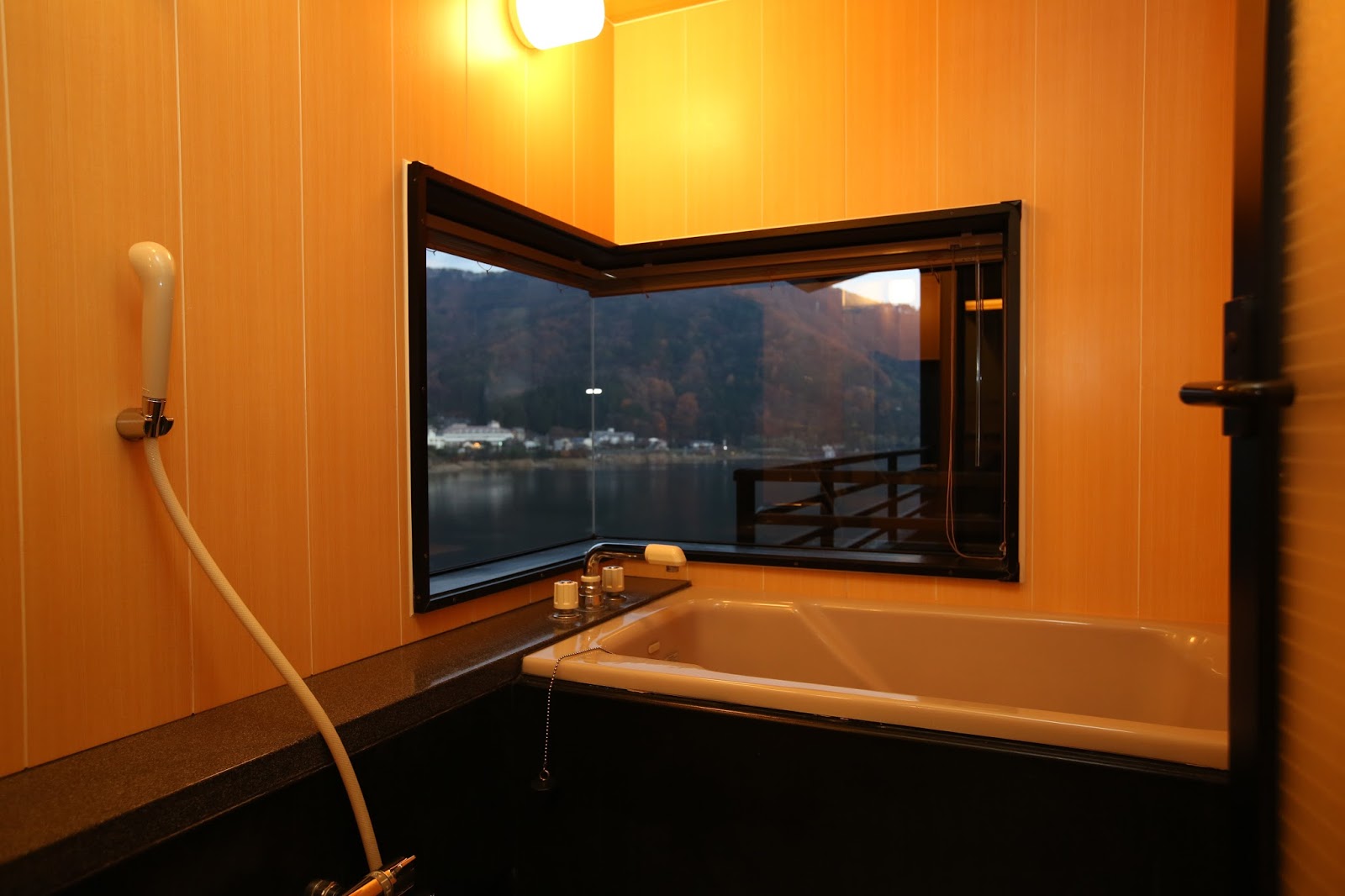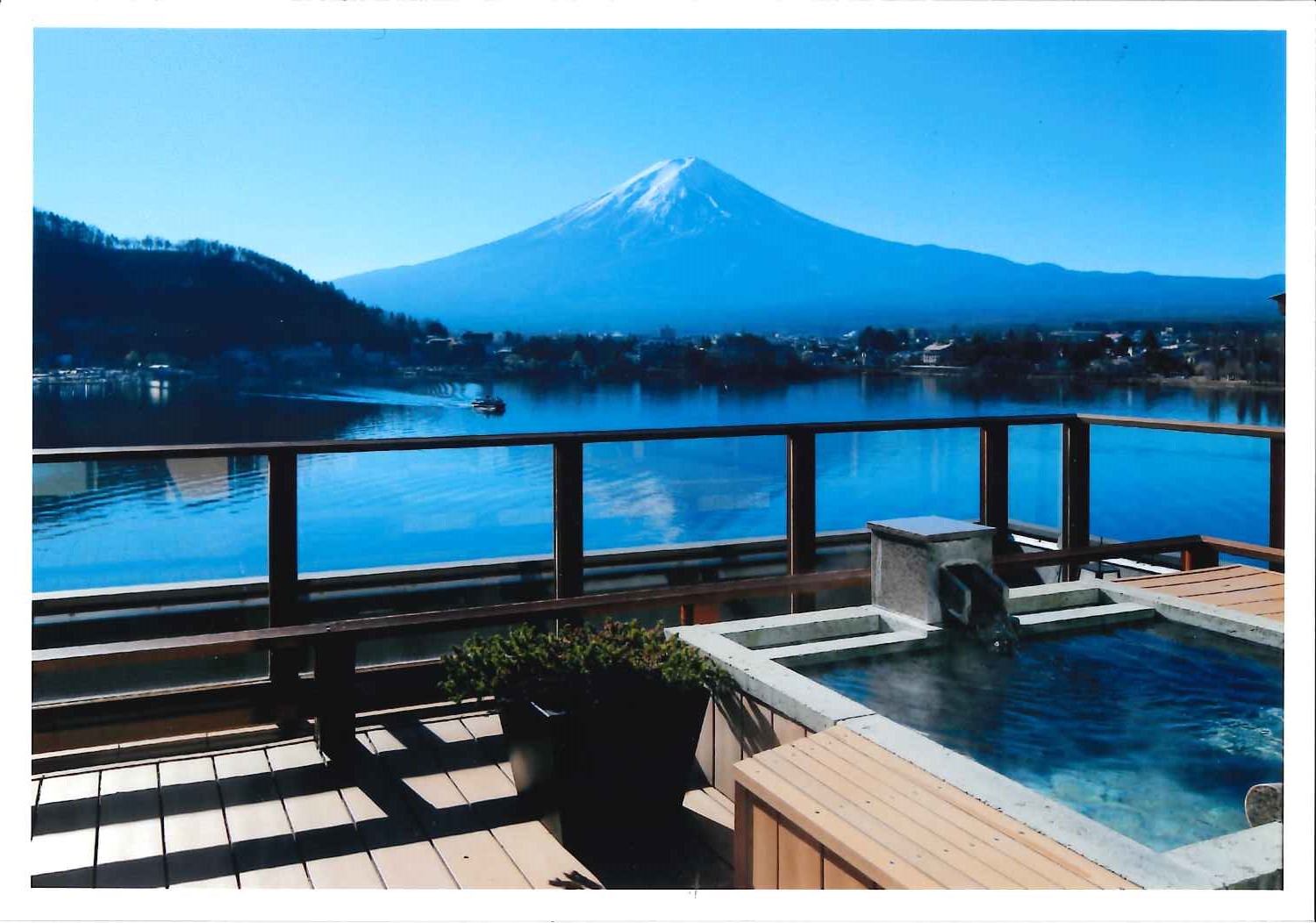 雖然是溫泉旅館,但仍然配置了相當豪華的泡澡浴缸。外面窗景就是河口湖的美景。
