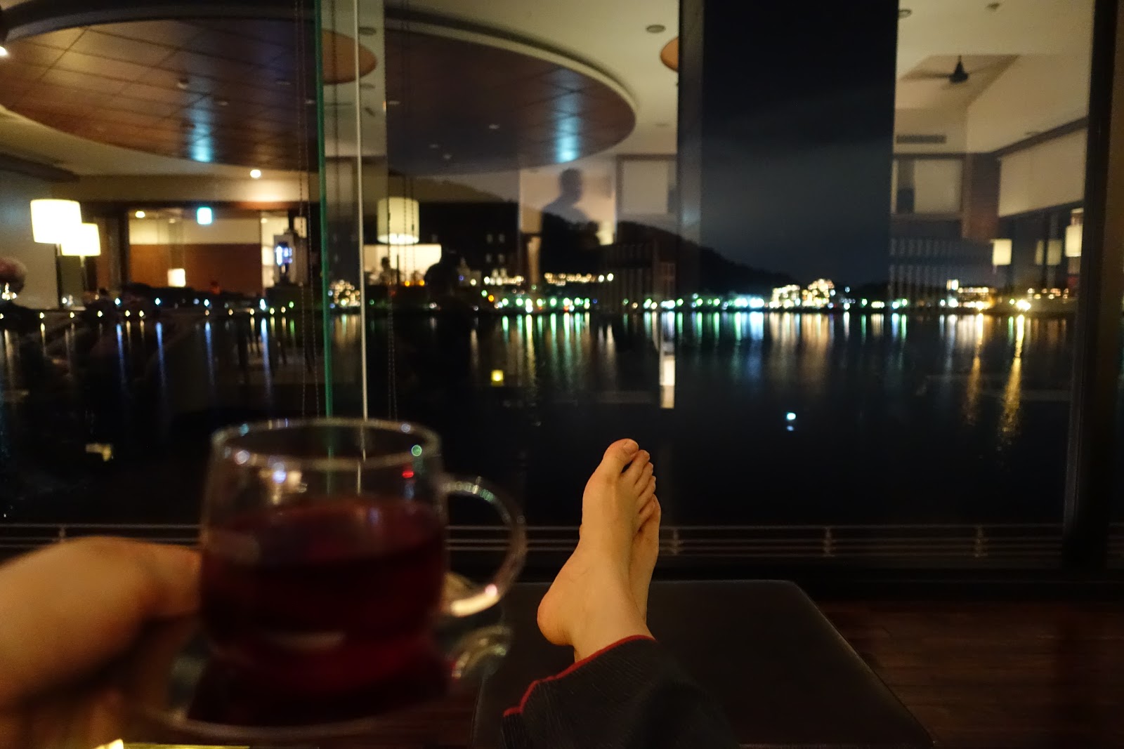 外面的夜景百看不膩,一邊喝著溫暖的茶,一邊向遠遠隱藏在黑夜中的富士山道晚安。