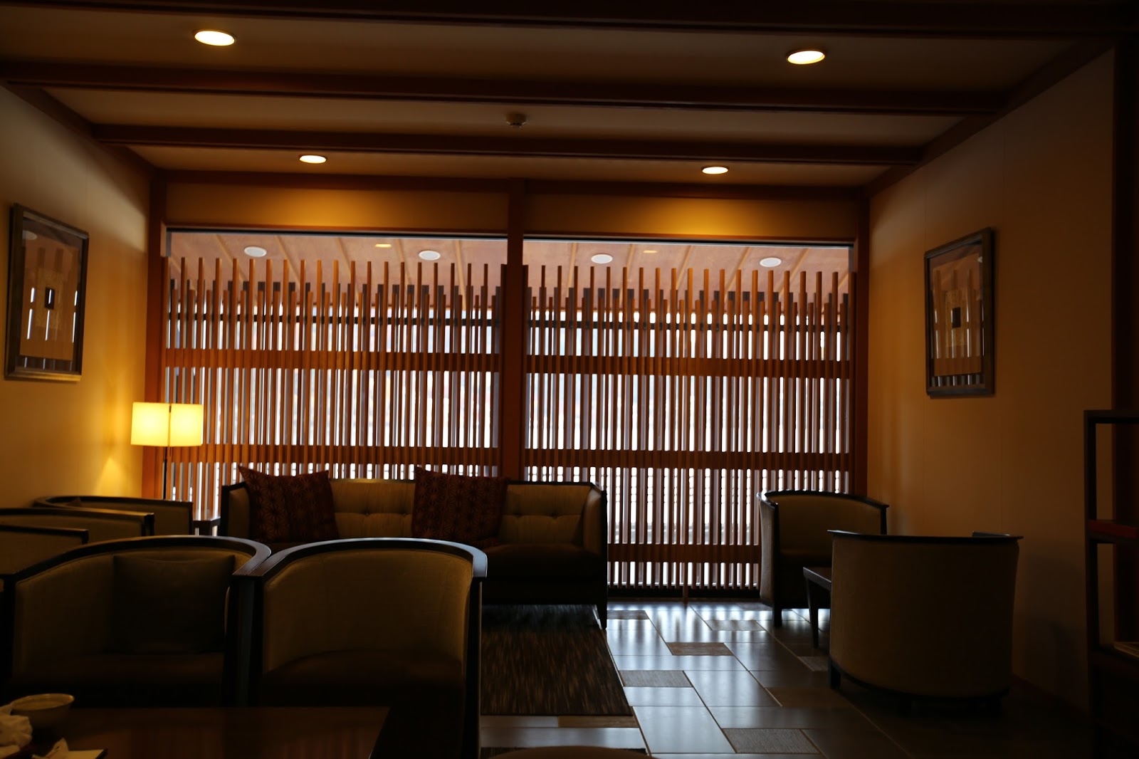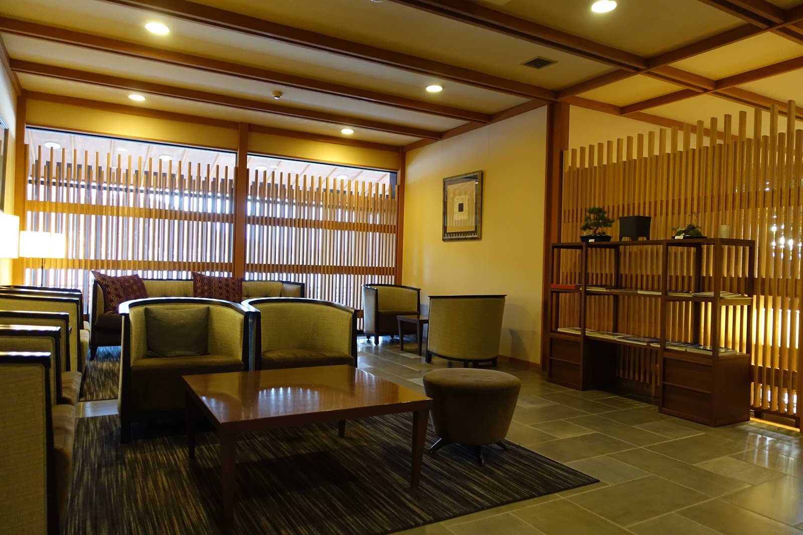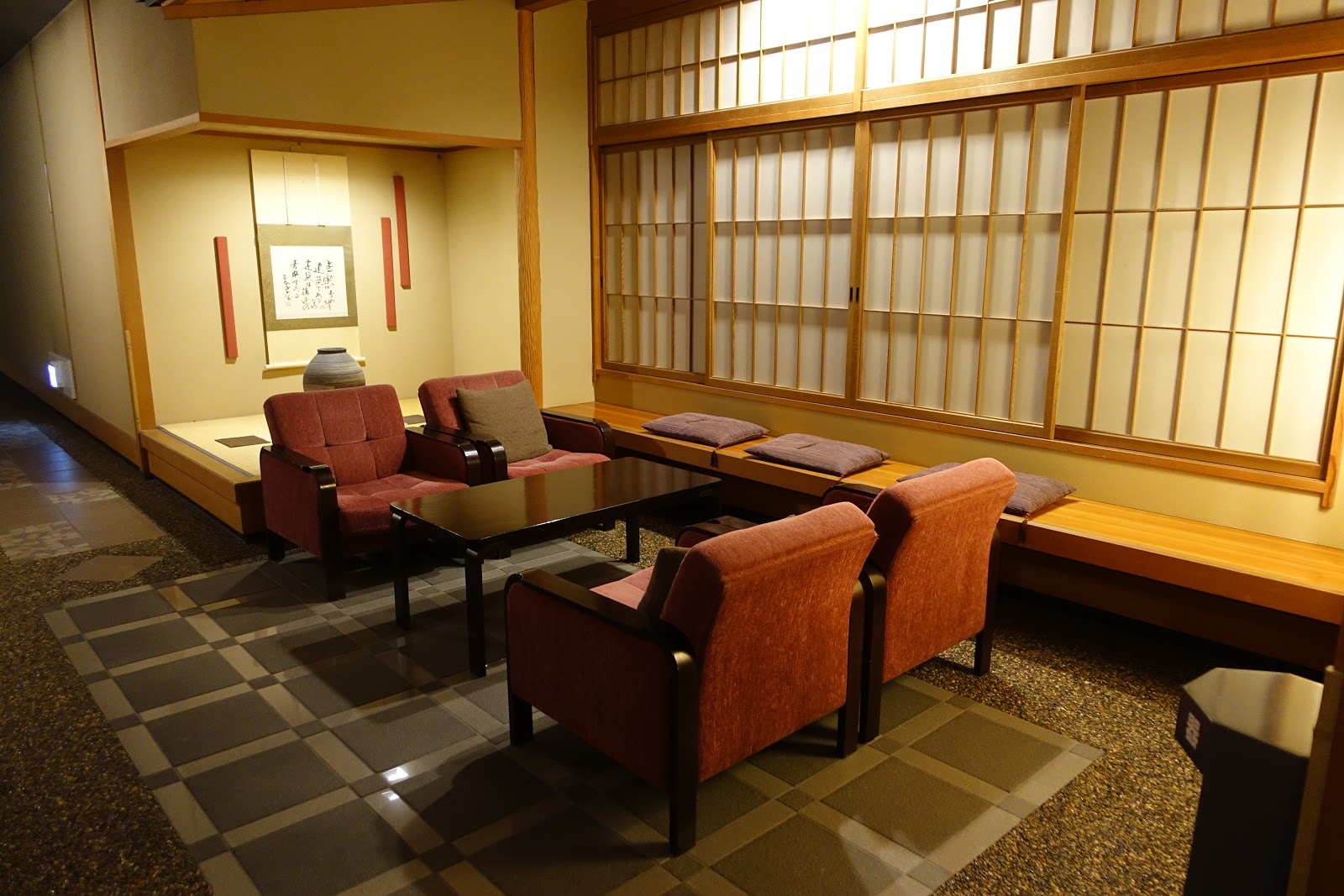 往浴池的路上會經過飯店公共區域設置的簡單會客休息區。這時候我們都已經換好浴衣,不用事先洗澡,公共浴池旁邊會有洗澡的地方。
