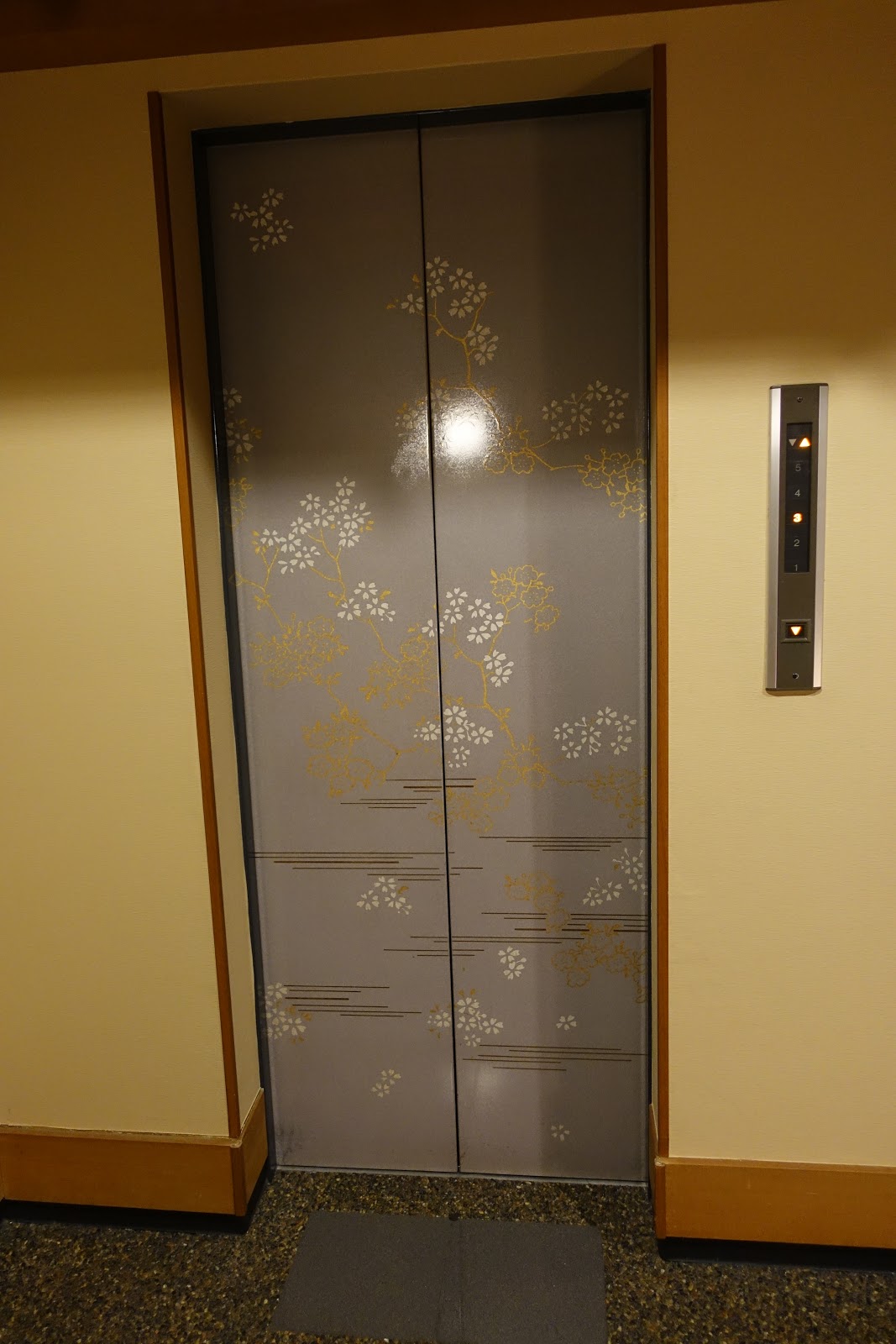 最後是由這個櫻花樣式的電梯帶領我們前往泡湯區,進了這邊以後開始就要男女分開行動囉,然後請深吸一口氣,因為日本的大眾溫泉都是完全裸湯形式,麻煩務必大大方方的脫衣服,扭扭捏捏反而會更引人側目!