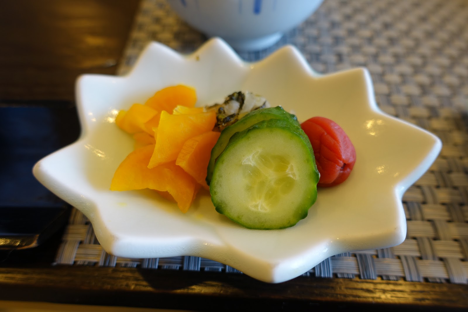 以往吃到的日本涼拌菜經常過於死鹹,是到了那種一口小菜能配一碗白飯的程度,導致我很排斥吃。但這次聽說漬物不會有我想像中的那些問題,特別嘗試了幾口,還真的完全擺脫鹹死人不償命之困擾,終於可以好好享用配菜了。