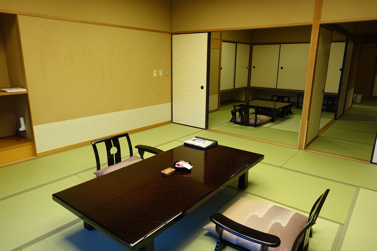 先前有提到一個小秘密,就是我們刻意安排了去泡湯的時間請他們來鋪床,其不可告人之處就在於,一般如果有選一泊二食組合的話,鋪床時間會在用完晚膳以後。但是由於先前訂飯店時沒有注意到晚餐要提前預約才有供應,以為入住以後再跟飯店講應該就行了,以致於我們當天晚上是沒有東西可以吃的啊!!!